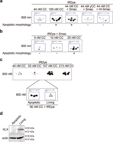 Figure 4. A cytochrome c threshold exists in oocytes and is lowered by Smac addition(A) Oocytes were microinjected with IRDye and either sub-threshold CC (44 nM), supra-threshold level of CC (107 nM), 44nM CC plus Smac protein, 44nM yCC plus Smac, or 44nM CC plus Smac that had been heat-inactivated by heating at 95°C for 5 minutes (HI-Smac) and then imaged after 40 minutes. Smac was injected to a concentration of 280 nM. Average oocyte fluorescence is displayed in Supplemental Figure 1i. (B) Low doses of CC were injected with the IRDye and Smac and imaged after 30 minutes. Average oocyte fluorescence is displayed in Supplemental Figure 1j. (C) Oocytes were injected with IRDye and increasing doses of CC and imaged after 45 minutes. Naive oocytes from the same batch were then injected with IRDye and 90nM CC, observed for apoptotic morphology and then 3 apoptotic and 3 living oocytes were imaged for fluorescence. Average oocyte fluorescence is displayed in Supplemental Figure 1k. (D) Lysates were prepared from the apoptotic and living oocyte groups described in C and then immunoblotted for XLX.