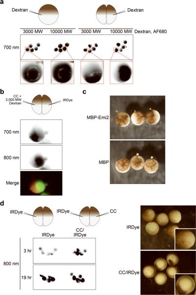 Figure 7. Apoptosis is not cell-autonomous in the early embryo(A) Fluorescent dextrans were injected as indicated and then embryos were imaged 30 minutes later. (B) One embryo injected as indicated and imaged 30 minutes later. Signal in the 700 nm channel represent fluorescent dextran and signal in the 800 nm channel represents IRDye cleavage. (C) Emi2 mutant protein was injected into one blastomere at the two-cell stage and photographs were taken approximately 4 hours post-fertilization. The embryo on the left demonstrates full arrest, rather than arrest of only the injected side. (D) Left, Embryos were injected as indicated (approximately 2 hours post-fertilization) and imaged for fluorescence at the indicated times after fertilization. Right, photographs of the embryos 19 hours post-fertilization, confirming IRDye-injected embryos are dividing normally and show no signs of apoptosis.