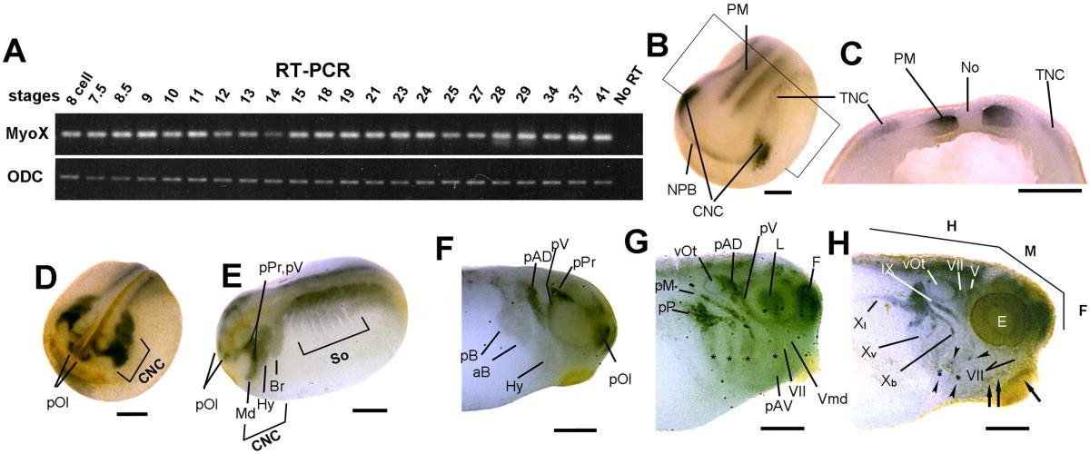 Figure 1. Spatial and temporal expression of MyoX in Xenopus. A: Reverse transcriptase-polymerase chain reaction (RT-PCR) analysis. MyoX mRNA was detected at all embryonic stages. B-H: Whole-mount in situ hybridization (ISH); stages are as follows: St. 16 neurula (B,C), St. 19 neurula (D), St. 21 tail bud (E), St. 24 tail bud (F), St. 33 tadpole (G), and St. 38 tadpole (H). Panel (C) is a transverse section of the embryo in panel (B). Early MyoX expression is most abundant in cranial neural crest (CNC), trunk neural crest (TNC), paraxial mesoderm (PM) and the anterior neural plate border (NPB). D-G: Later, strong expression is visible in placodes. In the tadpole, MyoX signal is elevated in cranial nerve V sim X, termini of nerve IX, X (arrowheads) and three termini of nerve VII (arrows, also see Supp. Fig. S3), and in epibranchial placodes (asterisks, G). aB, anterior branchial arch; Br, branchial arch; F, forebrain; H, hindbrain; Hy, hyoidal arch; IX, glossopharyngeal nerve; L, lens placode; M, midbrain; Md, mandibular arch; No, notochord; So, somites; pAD, anterodorsal placode; pAV, anteroventral placode; pB, posterior branchial arch; pM, middle lateral line placode; pOI, olfactory placode; pP, posteriorlateral line placode; pPr, profundal placode; pV, trigeminal placode; V, trigeminal nerve; Vmd, mandibular branch of trigeminal nerve; VII, facial nerve; vOt, otic vesicle; Xb, branchial branch - cranial nerve X; Xl, lateral branch - cranial nerve X; Xv, visceral branch - cranial nerve X.