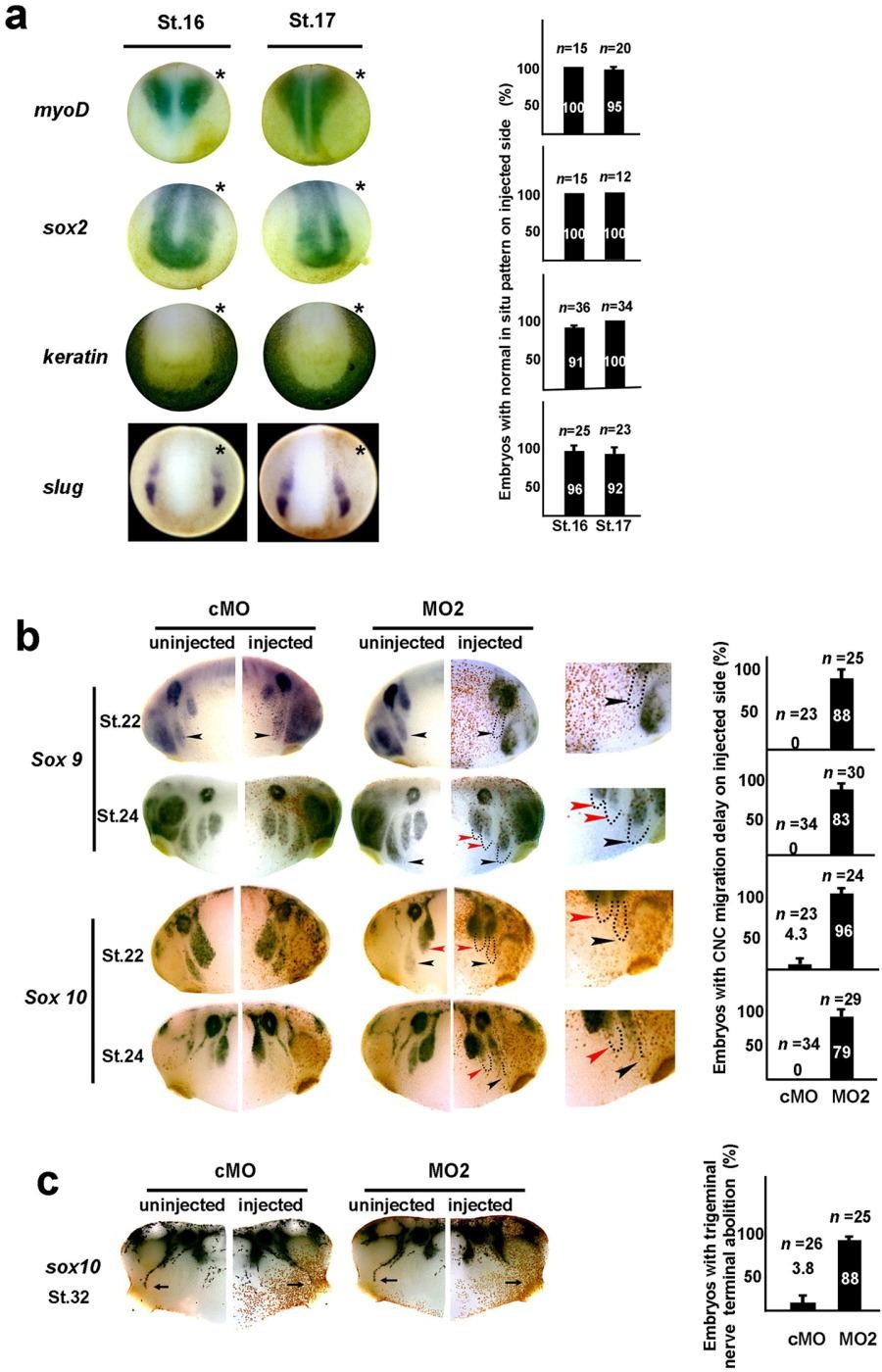 Figure 3. MyoX knockdown inhibited cranial neural crest (CNC) migration and delays trigeminal nerve outgrowth. A: MyoX knockdown does not disrupt early induction of NC. Embryos were injected into one cell at the two-cell stage with 30-ng MO2 and 5 ng of fluorescently labeled control MO, cultured to stage 16/17, sorted using a fluorescent dissecting microscope to identify the injected side (on right in all cases shown, indicated by asterisks) and processed for whole-mount in situ hybridization with probes for mesoderm (myoD), neural plate (sox2), epidermis (keratin), and NC (snail2). No effect was observed. B: MyoX knockdown inhibits cranial NC cell migration. Embryos unilaterally injected at two-cell stage with Control MO (cMO) or MO2, along with nuclear-localized lacZ RNA for lineage tracing, followed by Red-Gal staining (Research Organics), then whole-mount in situ hybridization with Sox9 and Sox10 probes. St. 22; ventral migration of hyoid arch NC (black arrow head) and branchial arch NC (red arrow heads, dashed lines) was inhibited compared with the uninjected side (Sox9, 88%, n = 25; Sox10, 96%, n = 24.). The control MO had no effect. St. 24; migration into all three arches occurred but was still retarded on the MO2-injected side (Sox9, 83%, n = 30; Sox10, 79%, n = 29). Enlarged views of the relevant regions from the MO2-injected side are shown to the right. C: The trigeminal nerve was affected by loss of MyoX. Control MO or MO2 injected into one cell at the two-cell stage. By St. 32, the distal region of the trigeminal nerve (arrows on the uninjected sides - left) was absent on the MO2-injected side (88%, n = 25). The control MO (n = 26) had no effect. Percentages and standard deviation error bars indicated to right as bar graphs.