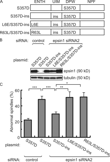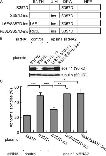Figure 4. Epsin1 regulates spindle integrity through its membrane-bending ENTH domain. (A) Domain structure of epsin1 expression constructs with the indicated mutations. The ENTH domain interacts with membrane and has membrane-bending activity. The ubiquitin-interacting motif (UIM) binds to ubiquitin. DPW motifs interact with AP2. The NPF motif interacts with proteins such as Eps15. The mutant epsin1Ser357D (S357D) mimics the mitotic phosphorylated form. The RNAi-insensitive rescue construct epsin1Ser3573D-ins (S357D-ins) contains mutations in wobble codons in the sequence corresponding to siRNA2, which do not affect protein sequences. Mutant epsins epsin1L6E/Ser357D-ins (L6E/S357D-ins) and epsin1R63L/Ser357D-ins (R63L/S357D-ins) are derived from epsin1Ser357D-ins but contain an additional point mutation in the ENTH domain that abolishes the membrane-bending activity of epsin1. (B) Western blot analysis of epsin1 expression in HeLa cells. Epsin1Ser357D expression was inhibited by siRNA2 but not by control siRNA, whereas expression of epsin1Ser357D-ins, epsin1L6E/Ser357D-ins, and epsinR63L/Ser357D-ins was not affected by treatment with siRNA2. (C) Rescue of spindle morphology defects in HeLa cells by epsin1Ser357D-ins but not by epsin1L6E/Ser357D-ins or epsin1R63L/Ser357D-ins. The percentage of defective spindles, as judged by α-tubulin and pericentrin staining, was quantified in HeLa cells cotransfected with the siRNA oligonucleotide and each expression construct. The percentages of cells with abnormal spindle morphology from at least three independent experiments are shown, with >100 prometaphase and metaphase cells counted in each condition per experiment. Error bars show standard deviation. *, P < 0.05; **, P < 0.01; ***, P < 0.001.