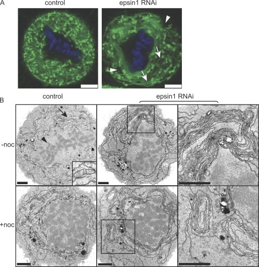 Figure 2. Effects of epsin1 reduction on membrane organization in mitotic HeLa cells. (A) Control or epsin1-depleted cells were labeled with DiOC6(3) and Hoechst 33258 to visualize membranes and chromosomes, respectively. Confocal images of mitotic cells at one z section are shown. Epsin1 depletion caused aberrant membrane morphologies such as areas without fluorescent signal (arrowheads) or long-running membrane tubules or sheets (arrows), which were not seen in normal control cells. (B) EM images of control siRNA– or epsin1 siRNA2–treated cells are shown. Control mitotic cells have even membrane structures (arrow) surrounding the condensed chromosomes (arrowhead). An area containing mitochondria is enlarged in the inset (top left). Abnormal membrane structures such as whorls with multiple layers of membranes are present in epsin1 siRNA2–treated mitotic cells. Cells were analyzed 3 d after RNAi treatment with or without nocodazole arrest (+noc). Similar results were obtained with an additional epsin1 siRNA oligonucleotide (siRNA1). Boxed areas in the middle panels are enlarged in the right panels. Bars: (A) 5 μm; (B) 2 μm.