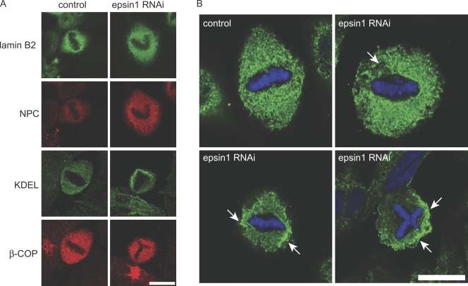 Figure 3. Mitotic ER network marked by the KDEL antibody is affected by epsin1 reduction in HeLa cells. (A) Confocal images of markers for subcellular compartments in mitosis in control or epsin1 knockdown cells. The maximum projection of images obtained for nuclear lamina (lamin B2), nucleoporins (nuclear pore complex [NPC]; labeled by MAb414), ER (KDEL), and Golgi (β-COP) is shown. (B) Confocal section of mitotic cells stained by the KDEL antibody, which marks the ER network. Arrows indicate areas of uneven ER membrane distribution around condensed chromosomes in mitotic cells after epsin1 knockdown by RNAi, which are not seen in normal control cells. Bars, 10 μm.