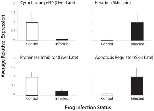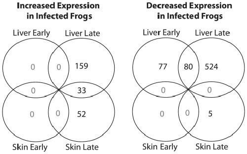 Figure 1. Summary of significant changes in gene expression between Bd-exposed and naïve control frogs.Numbers of genes with increased and decreased expression in infected frogs are shown for the skin (the site of infection) and the liver (an immunologically and physiologically important organ). Data are summarized for two time-points: early (3 days after initial exposure to Bd) and late (when clinical symptoms of chytridiomycosis are evident).