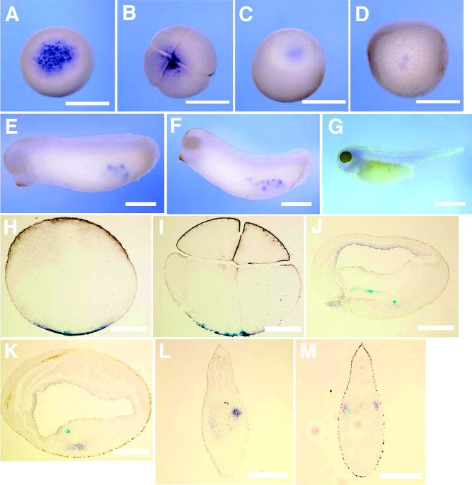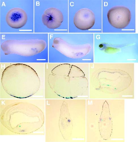Figure 5. Spatial expression patterns of Xtcat-2 mRNA analyzed by whole-mount in situ hybridization. A: Fertilized egg (St.1). B: Eight-cell stage embryo (St. 4). C: Mid-gastrula (St. 11). D: Late neurula (St.18). E: Early tail bud (St. 26). F: Late tail bud (St. 30). G: No cells expressing Xtcat-2 mRNA are observed at St. 40. H,I: Section of Xtcat-2 stained fertilized (H) or eight-cell stage (I) embryo revealed the localized expression of Xcat-2 mRNA. J,K: Sagittal section of Xtcat-2-stained St. 11 (J) or St. 18 (K) embryo. L,M: Transverse section of tail bud stained with Xtcat-2 at the same stage of E and F, respectively. Scale bars = 500 mu m in A-G, 200 mu m in H-M.