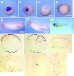 Figure 3. Spatial expression patterns of Xenopus tropicalis DAZ-like gene (Xtdazl) mRNA until neurula stage by whole-mount in situ hybridization. A,B: Section of Xtdazl-stained oocyte showed that Xtdazl mRNA was expressed in the perinuclear region in a stage (St.) I oocyte (A) and (B) in the vegetal pole of a stage III oocyte. C: Section of St. 4 embryo stained with Azan. Arrows indicate vegetal pole cytoplasm. D-I: Spatial distribution of Xtdazl mRNA in a fertilized egg (St.1, D), eight-cell stage embryo (St. 4, E), late blastula (St. 9, F), gastrula (St. 10.5, G), early neurula (St.13, H), and late neurula (St. 18. I). J-L: Section of St.1 (J), St.4 (K), and St. 9 (L) embryo with staining for Xtdazl. Animal side is up. M-O: Sagittal section of Xtdazl-stained embryo at the gastrula stage (St. 10.5, M), early neurula stage (St.13, N), and late neurula stage (St. 18, O). Scale bars = 100 mu m in A,B, 200 mu m in C,J-O, 500 mu m in D-I.