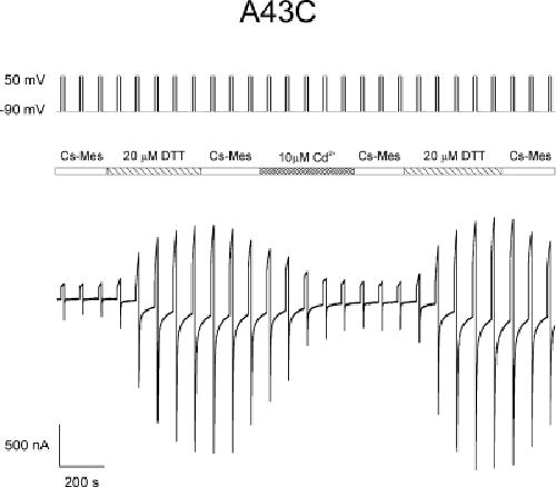 Figure 3. DTT and cadmium alter levels of A43C currents. Macroscopic currents elicited from an oocyte expressing A43C unapposed hemichannels with the voltage paradigm shown at the top of the panel. The central bar indicates the time and duration at which the bath solution containing 100 mM Cs-MES, 1.8 mM CaCl2, and 10 mM HEPES, pH 7.6, was exchanged with the same bath solution except containing either 20 µM DTT or 10 µM CdCl2. Currents increased to a steady-state level approximately fivefold greater than the initial currents after exposure to 20 µM DTT and decreased to ∼80% of maximum after treatment with 10 µM CdCl2. The reduction in current was not changed substantially by washing with the bath solution but was reversed to pre-cadmium levels after wash with 20 µM DTT. |