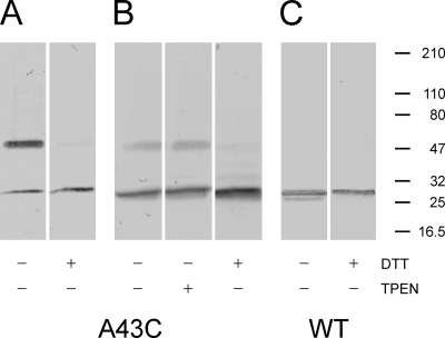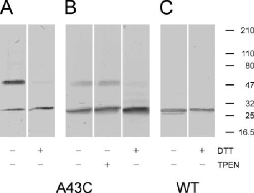 Figure 4. Western blots of WT (Cx32*Cx43E1) and mutant (A43C) membrane-inserted hemichannels. + and − symbols at the bottom of each panel denote treatment of the sample with or without either 50 mM DTT or 10 mM TPEN before SDS-electrophoresis through 5–40% gradient polyacrylamide gels. The position of pre-stained molecular weight standards (Thermo Fisher Scientific) are presented as bars on the right side of the figure. The band with molecular weight ∼50 kD corresponds to a connexin dimer, whereas the monomer has an electrophoretic mobility comparable to a molecular weight standard of ∼27 kD. Only treatment with DTT reduces the dimer to the monomeric connexin form. |