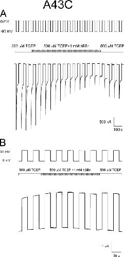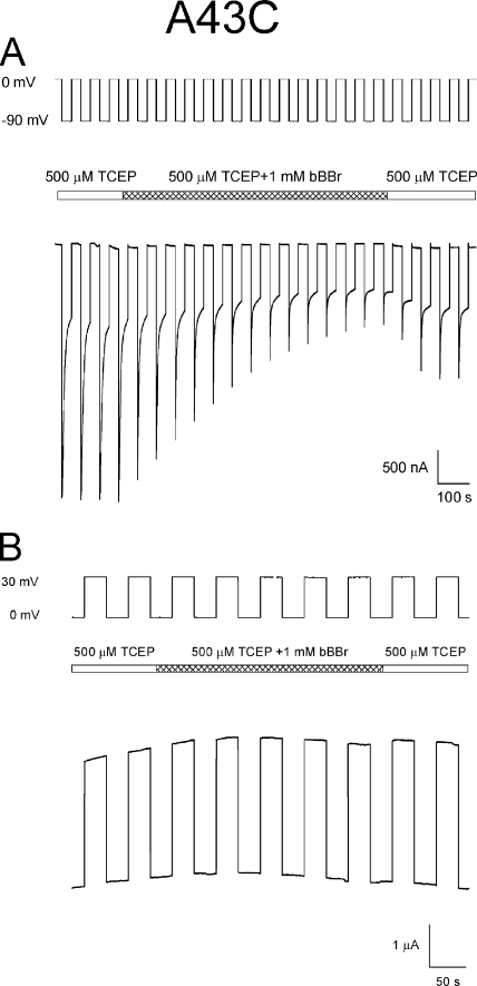 Figure 6. Modification of A43C residues by bBBr occurs at voltages that favor channel closure. (A) Macroscopic currents attributable to A43C channels are irreversibly decreased when exposed to bBBr during a voltage paradigm, steps between 0 and −90 mV, which elicits gating transitions between the open (0 mV) and either loop- and/or Vj-gating closed states (−90 mV). (B) Application of bBBr during a voltage paradigm, steps from 0 to 30 mV, which favors population of the open-channel state, has no effect on A43C macroscopic currents. The central bar in both panels indicates the time and duration for which the bath solution containing 500 µM TCEP was exchanged with the same bath solution containing 1 mM bBBr and subsequently washed with TCEP containing bath solution. |