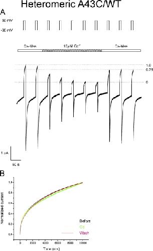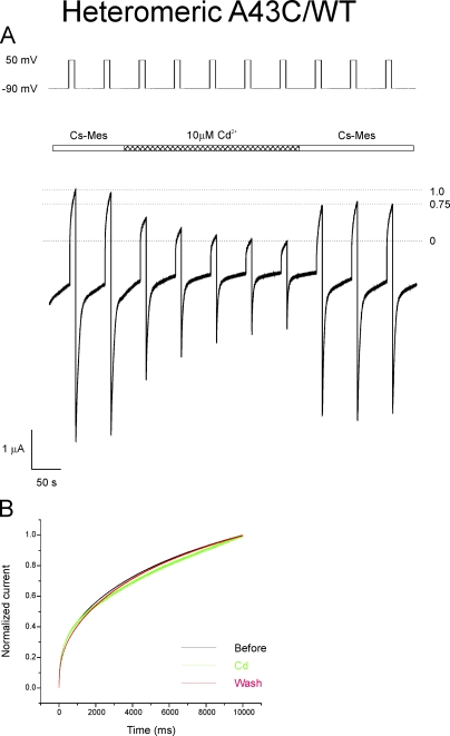 Figure 7. Effect of 10 µM CdCl2 on heteromeric channels formed by coexpressing 1:1 mixtures of WT and A43C RNA. (A) Heteromeric channels were treated with 20 µM DTT and washed with Cs-MES, 1.8 mM Ca2+ bath solution before the application of Cd2+ shown in the trace segment. After the reduction of macroscopic currents by treatment with 10 µM CdCl2, currents were restored to 75% of pre-cadmium levels by washing with cadmium-free bath solution. The result is interpreted to indicate that 25% of channels form a high affinity cadmium site that “locks” the channel in a closed conformation (see Results). (B) Comparison of the kinetics of channel activation upon depolarization to 50 mV before (black trace), during (green trace), and after (red trace) the application of Cd2+ in the trace shown in A. The two current traces before Cd2+ were averaged, as were the final two current traces after wash. The green trace is current trace obtained just before wash with Cd2+-free solution. The similarity among normalized traces indicates that the differences in current levels are not a consequence of differences in the kinetics of activation, but most likely reflects the proportion of channels that can be activated by the voltage step. |