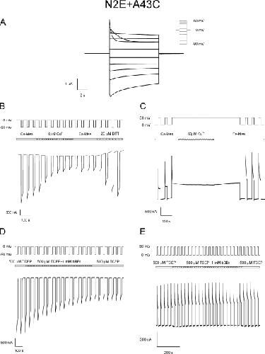 Figure 8. Unapposed N2E+A43C hemichannels are locked by cadmium and accessible to bBBr modification when the channel is closed by loop gating, but not Vj gating. (A) Macroscopic current traces obtained from N2E+A43C unapposed hemichannels after polarizations to voltages shown in the inset of 0 mV. Current relaxations at hyperpolarizing and depolarizing potentials result from the closure of loop and Vj gates, respectively. (B) Macroscopic currents were recorded from oocytes expressing the double mutation, N2E+A43C. The N2E mutation reverses the polarity of Vj gating from closure at hyperpolarizing potentials to closure at depolarizing potentials but does not change the polarity of loop gating. The application of 10 µM CdCl2 during a series of voltage steps between 0 and −90 mV causes a large decrease in membrane currents that can only be reversed by treatment with 20 µM DTT. Polarizations to −90 mV strongly favor the closure of loop gates, whereas residency in the open state is favored at a holding potential of 0 mV. (C) Macroscopic currents recorded from N2E+A43C oocyte using a similar protocol to that used in Fig. 5 B. 10 µM CdCl2 was applied to the channel after a long-duration depolarizing step to 50 mV that strongly favors closure of only the Vj gates. After wash with Cs-MES bath solution, the effect of cadmium on Vj gate closed channels was assessed by the application of a series of polarizing steps between 0 and 50 mV. This polarization elicits gating transitions between the open and Vj-gating closed states. Currents were similar to those obtained before cadmium application, demonstrating that A43C residues do not coordinate cadmium when the channel is closed by Vj gating. (D) Macroscopic current traces elicited by repeated polarizations between 0 and −90 mV, a voltage paradigm that elicits transitions between open and loop gate closed channels. At the position indicated, channels were exposed to 1 mM bBBr in the presence of 500 µM TCEP and subsequently washed with 500 µM TCEP. The observed reduction in current is consistent with a reaction between the A43C residue and bBBr. (E) Macroscopic current traces elicited by repeated polarizations between 0 and 50 mV, a voltage paradigm that results in the opening and closing of Vj gates. At the position indicated, channels were exposed to 1 mM bBBr in the presence of 500 µM TCEP and subsequently washed with 500 µM TCEP. The absence of any reduction in current is interpreted to indicate the inaccessibility of A43C residues to bBBr modification when the N2E+A43C channel resides in the open state and the Vj-gated closed state. |