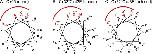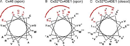 Figure 10. Helical wheel representation of reactive residues at the TM1/E1 border of Cx46 and Cx32*Cx43E1. (A) Helical wheel representation of residues R33 through G46 of Cx46. The residues span the TM1/E1 border, with residue E42 believed to be located on the membrane border. Residues accessible to MTS reagents applied to both the intercellular and extracellular face of the unapposed hemichannel are shown in red. These residues reside on one side of the helix, subtend an arc of ∼80°, and line the pore of the open Cx46 unapposed hemichannel. Residue R33 is topmost in the figure, with the residue number increasing counterclockwise. Data are taken from Kronengold et al. (2003). (B) Helical wheel representation of homologous residues R32 through G45 of Cx32*Cx43E1 that line the pore of the open unapposed Cx32*Cx43E1 channel. Residues examined in this study are marked with asterisks. Two residues, V38C and G45C, react with MTSEA–biotin-X when the reagent is applied from either the intracellular or extracellular face of the channel and consequently are assigned as pore lining. Expression levels of S42C and E41C were insufficient to allow studies of accessibility to thiol modifying reagents, whereas W44C did not express membrane current. These residues are marked by two asterisks. (C) Helical wheel representation of the loop gate closed Cx32*Cx43E1 channel. The helical wheel pictured in B was rotated 140° clockwise to position residues A40C and A43C. This position accounts for the observed sensitivity of residues A40C and A43C to Cd2+ and their modification by bBBr when the channel is closed by loop gating (see Discussion). |