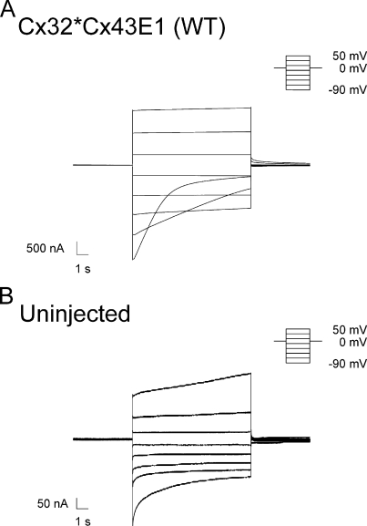 Figure 1. (A) Macroscopic current traces obtained from WT Cx32*Cx43E1 unapposed hemichannels after polarizations in 20-mV increments between −90 and 50 mV from a holding potential of 0 mV. The small increase in current level at large positive voltages results from the activation of an endogenous oocyte channel as assessed by recording uninjected oocytes. (B) Macroscopic current traces obtained from an uninjected oocyte illustrating typical endogenous currents present in oocytes obtained from Xenopus 1 frogs in Cs-MES bath solutions. There is variability in the form and magnitude of endogenous currents among oocytes, but in most cases endogenous currents contribute <300 nA. |