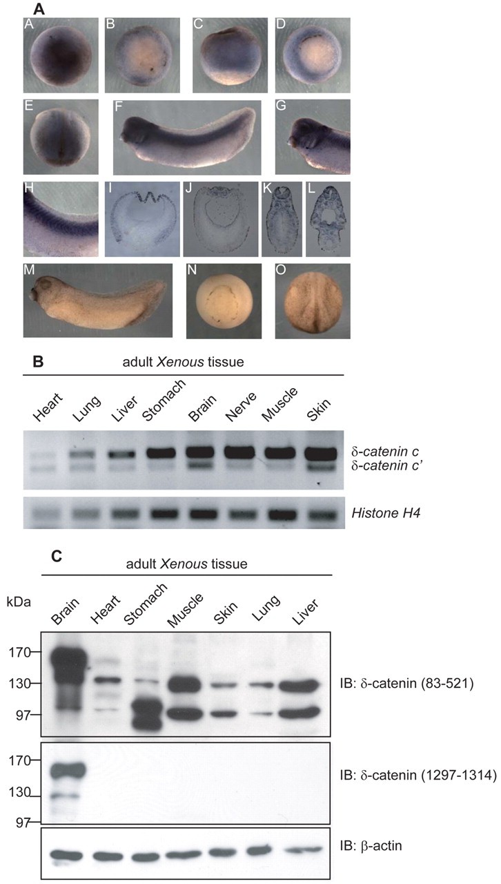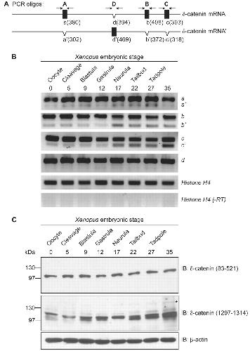 Figure 2. enopus δ-catenin temporal expression profiles. (A) Schematic diagram of δ-catenin alternative splicing events, and the PCR primers used to resolve them. The nucleotide lengths of PCR products are indicated in parentheses. (B) RT-PCR analyses indicate δ-catenin transcripts are deposited maternally and expressed throughout early embryonic stages. Both long (a,b,c) and short (a′,b′,c′) splicing variants were detected, with b′ and c′ having increased expression following neurulation. (C) Immunoblotting confirms δ-catenin protein expression throughout Xenopus embryogenesis. Antibodies directed against Xenopus amino acids 83-521 (N-terminal domain) recognize a δ-catenin isoform migrating at approximately 100 kDa; antibodies directed against Xenopus amino acids 1297-1314 (C-terminal domain) react mainly with a 100 kDa doublet, with reactivity additionally appearing at 130 kDa (marked with an asterisk) and 160 kDa (not shown, but see Fig. 3C). The 130 and 160 kDa bands are most evident following immunoprecipitation (results not shown). |