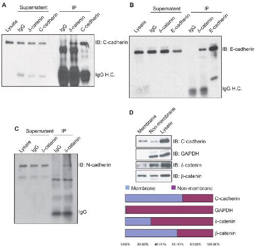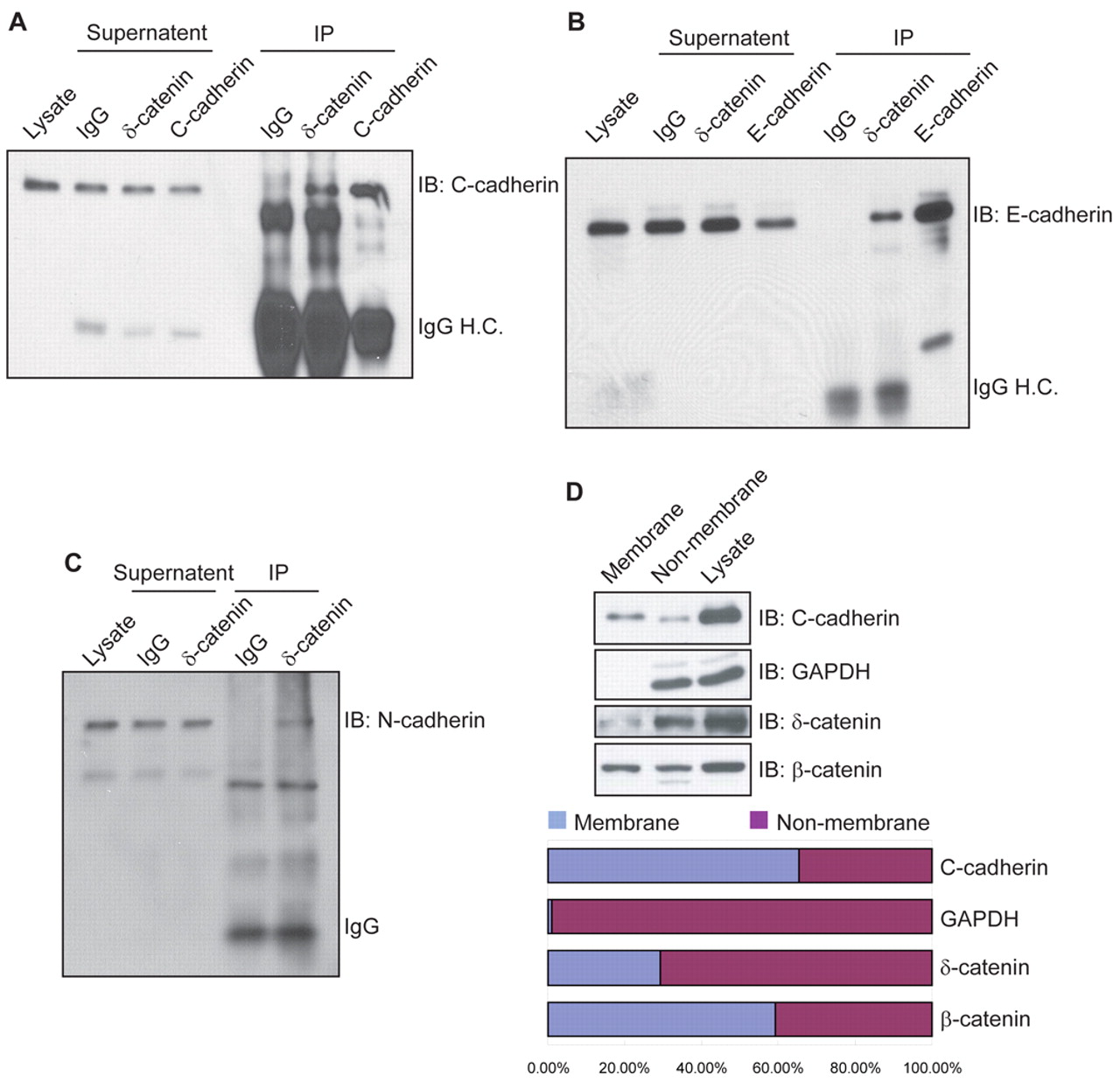 Figure 4. Xenopus δ-catenin associates with classical cadherins and displays a significant non-membrane-associated fraction. Endogenous δ-catenin complexes were immunoprecipitated using a C-terminus-directed antibody (1297-1314), and immunoblotted using antibodies direct against cadherins. Positive co-immunoprecipitation results suggest an association of δ-catenin with C-cadherin in gastrulating embryos (A), and with E-cadherin (B) and N-cadherin (C) in neurulation stage embryos. Immunoglobulin heavy chain (IgG H.C.) bands are included to reflect the specific versus negative control antibody input. (D) Crude membrane fractionations of gastrula embryos followed by immunoblot analyses indicate the predominant localization (∼70%) of endogenous δ-catenin within non-plasma-membrane pools. As expected, GAPDH is almost exclusively evident in the non-plasma-membrane pools. C-cadherin predominantly resides within the plasma-membrane pool (65%), with the remaining fraction likely to reflect associations with non-sedimenting vesicular stores, endoplasmic reticulum or Golgi. |