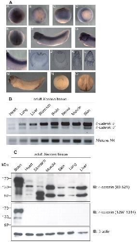Fig. 3. Spatial expression of Xenopus -catenin. (A) As viewed in animal versus vegetal regions, whole-mount in situ RNA hybridization detects -catenin mRNA signals in the ectoderm regions of blastula (subpanels A-C) and gastrula (subpanel D) embryos. At neurulation (subpanel E), the anterior and dorsal neural regions displayed the most apparent signals. Embryos at tadpole stages (subpanel F) showed a distinctive staining pattern in tissues of neural derivation such as brain, eye vesicle, ear vesicle, branchial arches (higher magnification in subpanel G) and spinal cord as well as somites (higher magnification in subpanel H). Subpanels I-L are cross-section views of paraffin-fixed embryos from corresponding stages. Sense probe hybridization was processed in parallel as negative controls (subpanels M-O). (B) RT-PCR analyses detect -catenin transcripts in all adult Xenopus tissues examined, with stronger expression in brain, nerve, muscle and skin. (C) Immunoblotting using an N-terminus-directed antibody detected three -catenin isoforms migrating at approximately 160, 130 and 100 kDa. The 130 and 100 kDa isoforms are ubiquitously present, whereas the 160 kDa appears to be brain specific. An antibody directed against the -catenin C-terminus reacts with the 160 kDa and 130 kDa isoforms in brain. |
