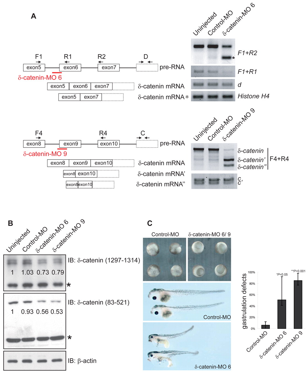 Figure 5. Antisense morpholino depletion of endogenous δ-catenin results in developmental defects. (A) Schematic diagram of the morpholino-based strategy, including the relative positions of PCR diagnostic primers. MO 6 targets δ-catenin RNA at the splice junction between intron 5 and exon 6, whereas MO 9 targets the junction between intron 8 and exon 9. MO 6 produces exon 6 elimination, with predicted codon frame-shift and early polypeptide termination. In addition to the normal transcript, RT-PCR confirmed (via DNA sequencing) the expected alteration in pre-RNA splicing (using oligos F1+R2; marked with an asterisk). Likewise, MO 9 results in alternative splicing, exon elimination and translational termination (PCR product marked with a single apostrophe was confirmed to be skipping of exon 9 and part of exon 8. An additional partial exon 10 deletion is indicated with a double apostrophe). δ-catenin transcription and mRNA stability did not appear to be significantly altered (oligos D and C, see also Fig. 2A), with histone H4 serving as an internal control. (B) Immunoblotting of gastrula stage embryo extracts confirmed the reduction of δ-catenin protein following morpholino injection. Non-specific bands (labeled with asterisks) and β-actin act as loading controls. Numbers indicate relative band intensities normalized to the uninjected control. (C) δ-catenin knockdown results in developmental phenotypes, including significant delays in blastopore closures and gastrulation defects (upper right panel). Although most embryos outwardly appear to recover from these effects and complete blastopore closure, the majority of MO-9-injected embryos were developmentally arrested during early tailbud or tadpole stages and subsequently died. For surviving embryos, abnormalities were again outwardly evident, particularly at tadpole stages, including shortened anterior-posterior axes, smaller craniofacial skeletons and eyes, malformed gut and edema (lower panel). Control embryos injected with standard morpholino displayed no obvious phenotypes (upper left and middle panel). P-values indicate statistical significance. |