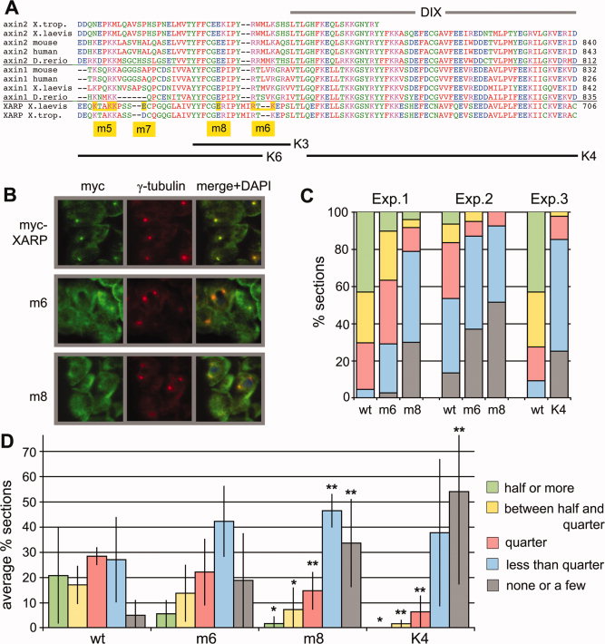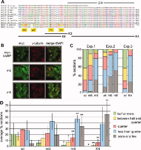 Figure 2. Point mutations upstream of the DIX domain compromise XARP centrosomal localization. A: Alignment of vertebrate Axin1, Axin2, and XARP proteins and location of the DIX domain, point mutations m5âm8, and some C-terminal deletions used in this study. X. laevis and X. tropicalis Axin2 and X. tropicalis XARP protein sequences were deduced from GenBank ESTs. B: Subcellular localization of wild-type, m6, and m8 myc-XARP. Staining was done as in Figure 1. C,D: In five independent blind experiments, 30â50 embryo sections expressing indicated XARP constructs were analyzed and classified according to the legend in D and Figure S2CâG. Three representative experiments (C) and averages ± S.D. from five experiments (D) are shown. *P with wild-type <0.1, **P with wild-type <0.05.