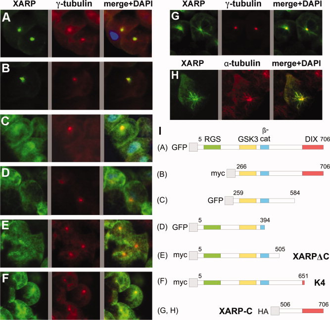 Figure 1. DIX domain is necessary and sufficient for XARP centrosomal localization. A–H: Xenopus embryos were injected with RNAs encoding indicated XARP constructs, cryosectioned at gastrula stage 10, and co-stained with rabbit GFP or myc antibody to detect XARP (green), mouse γ-tubulin antibody to detect centrosomes (red), and the chromatin marker DAPI (blue), except that in H, XARP Ab1 to detect XARP (green) and mouse α-tubulin antibody to detect microtubules (red) were used. I: Schematics of constructs used in A–H showing corresponding tags and amino acid numbers and the names of the constructs that were used in subsequent experiments.