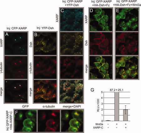 Figure 6. XARP localization in the presence of upstream components of the Wnt pathway. A–F: Xenopus embryos were injected with indicated combinations of RNAs and stained as in Figure 1, except that CFP-XARP and YFP-Dsh were detected by autofluorescence, and mouse anti-HA antibody was used to detect HA-Dsh. G: SuperTOPFlash reporter activation by Wnt3a in the absence or presence of HA-XARP-C.
