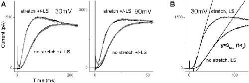 Figure 1. . (A) Effect of linear subtraction (LS). 5aa currents during depolarizations from −90 mV to 30 and 90 mV with (black) and without (gray) linear subtraction are compared as described in the text. The faster currents in each panel were recorded with stretch (using −45 mm Hg), the slower currents before and after stretch. Channel currents and capacitive transients are well separated. The traces demonstrate that nonleaky patches were used and that 5aa, with its slow activation, was an ideal mutant for the kinetic analysis undertaken here. Thus, although LS was used routinely (see materials and methods), it was not critical for obtaining accurate 5aa channel current amplitudes or maximum rates of rise. (B) Maximum slope line analysis. Maximum slope lines fitted to 30 mV leak-subtracted currents with/without stretch from A. The fit quantifies characteristic properties of current activation: SMax − maximum slope, and td − delay. |