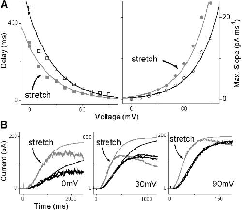 Figure 5. . The four-step model describes 5aa current properties with and without stretch. (A) Delay and maximum slope from 0 to 90 mV, with (gray symbols) and without −45 mm Hg suction (open symbols); voltage was stepped to the indicated levels from −90 mV. td(V) without stretch is fitted with Eq. 4, α0 = 1.4 s−1 and zα = 0.85. With stretch, the same zα, and α0 = 2.3 s−1 provide a good description. SMax(V) with and without stretch is well described by Eq. 3, multiplied by a linear driving force, and with the zα value from the delay fit. (B) Sample currents with (gray) and without stretch, before and after (black). PO(t) from Eq. 2 with zα and α0 from the td(V) fits in A has been scaled to match the current rise. |