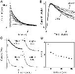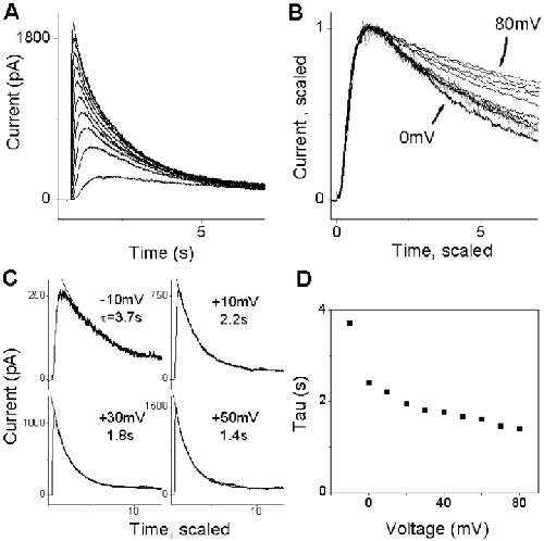 Figure 6. . 5aa slow inactivation. (A) In a typical experiment (15 μM Gd3+ in the pipette) currents were evoked by stepping from a holding potential of −90 mV in 10-mV increments from −10 to 80 mV, and recorded on a long time scale. (B) Currents from A. Amplitudes are normalized and the time scaled for each voltage so the rising phases overlap. Activation cannot be rate limiting for inactivation, because the scaled decline slows progressively with increasing voltage, with the sole exception of the response at −10 mV (the noisy, lighter colored trace). (C) The current falling phases can be fitted by Eq. 1. The time constant τ of the monophasic exponential decay to a constant plateau is given on each panel. (D) τ(V) declines with increasing voltage. |