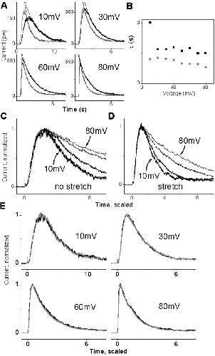 Figure 8. . 5aa current decline and stretch. (A) Sample currents with and without −45 mm Hg suction. The falling phases have been fitted with Eq. 1. Stretch decreases τ. (B) τ (V) with (gray circles) and without stretch (black squares). (C and D) The sample currents with and without stretch from A have been normalized, their times scaled to match all rising phases. The scaled falling phase decelerates with increasing voltage. Above 10 mV, where the falling phase is not rate limited by activation, the inactivation rate dominates falling phase dynamics. (E) Normalized currents with and without stretch. For each voltage, the time scale of the current with stretch has been expanded to match the rising phase of the current without stretch. Note that the entire scaled time courses are virtually identical. C and D showed that activation is not rate limiting for the current decline at these voltages and thus stretch, in contrast to voltage, seems to affect activation and inactivation in exactly the same way. |