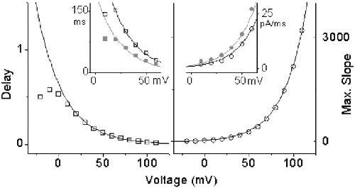 Figure 10. . Effect of back reactions with zβ < zα on td(V) and SMax(V). Simulated data. α0= 1, β0= 0.2, zα = 0.85, zβ = 1.7 (arbitrary units). From Eqs. A3 and A4, ≈−9 mV and V1/2 ≈ 0 mV. Symbols, simulated td(V) and SMax(V). Solid lines, predicted delay or maximum slope without deactivation (Eqs. 3 and 4). Simulated SMax(V) is indistinguishable from its counterpart for the irreversible model; simulated td(V) is well described at large voltages, but bends characteristically below 0 mV. PO(t) rise, and amplitudes (except at the lowest voltages) are well fitted by Eq. 2 (not depicted). (Inset) One of two observations of a bend in td(V). Experimental td(V) and SMax(V) relations with (gray symbols) and without stretch (open symbols). Delay fits (from which the bend region has been excluded) by Eq. 4, apparent α0= 1.9 s−1 and α0= 3.3 s−1 without and with stretch, respectively, zα = 1 for both. Maximum slope fitted with Eq. 3 (multiplied by linear driving force) and the same zα. As in the simulated example, current rise and amplitudes were well fitted by Eq. 2 with the parameters from the delay fit, except at the lowest voltages, where amplitudes were smaller (not depicted). |