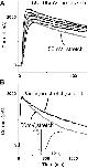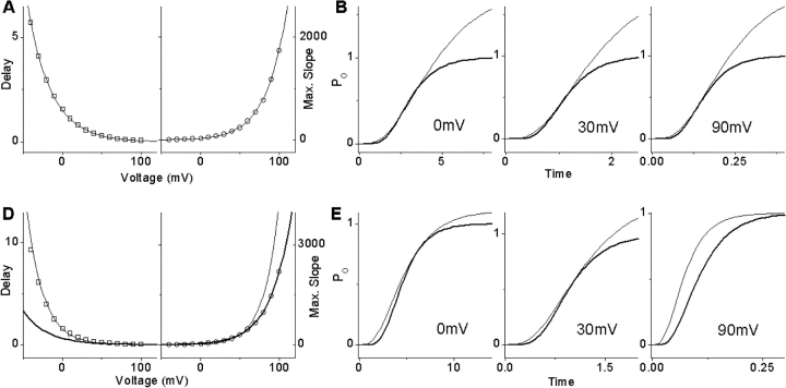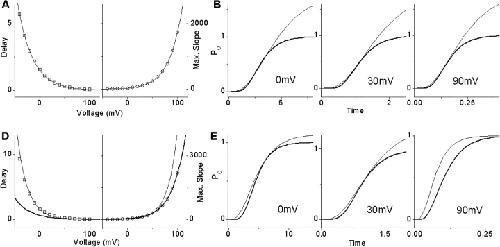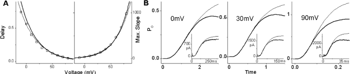 Figure 12. . Simulated kinetic data for four irreversible subunit activation steps and one final concerted transition with rate . α0= 1, zα = 0.85, γ0= 2, zγ = 0.42 (arbitrary units). (A) Symbols, simulated td(V) and SMax(V). Thick lines, predicted delay or maximum slope without (i.e., with infinitely fast) last step. Naturally, the additional step prolongs the delay and slows the current rise. Thin line (delay), fit of td(V) with Eq. 4, apparent α0= 0.65 and zα = 0.9. Thin line (slope), fit of SMax(V) with Eq. 3, zα forced to the value from the delay fit. SMax(V) is really somewhat biphasic, but can be described satisfyingly with zα = 0.9. (B) Simulated PO(t) (thick lines) and fits with Eq. 2, α0 and zα from the delay fit (thin lines). The fits look reasonable at all voltages. Upscaling of the fit expression is required, but if we encountered this effect in our experiments, we couldn't easily differentiate it from that of inactivation. |