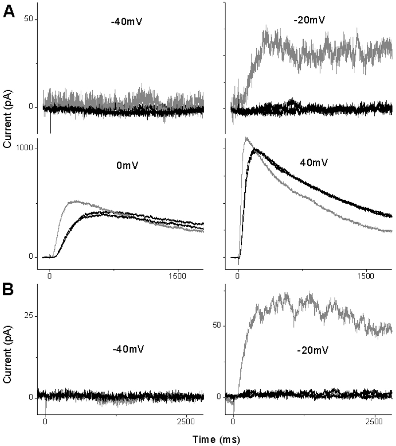 Figure 2. . The effect of stretch on 5aa currents elicited by a depolarizing step from −90 mV. Gray, current with stretch (−45 mm Hg suction); black, current without stretch (before and after). 20 μM Gd3+ in pipette. The most dramatic stretch effect for Shaker channels, including 5aa, occurs at the foot of the g(V), where stretch enables a voltage step to elicit current where there had been none without stretch. In these two examples (A and B; different patches), −40 mV was just at (A) or below (B) the threshold for this effect, whereas −20 mV was above it. Macroscopic currents were absent without stretch, but at −20 mV with stretch a large time-dependent current developed. At larger depolarizations (0 and 40 mV in A), stretch accelerated both current rise and decline. |