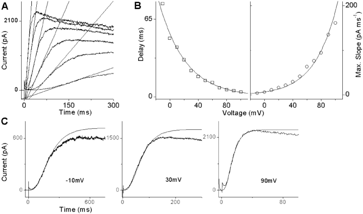 Figure 4. . Voltage dependence of delay td and maximum slope SMax for a family of 5aa currents evoked by stepping from a holding potential of −90 mV in 10-mV increments from −10 to 100 mV. (A) Sample currents (−10, 10, 30, 50, 70, 90 mV), with fitted maximum slope lines. (B) td (squares) and SMax (circles) versus voltage. td(V) can be fitted by a single exponential like Eq. 4, an expression from Scheme I. From the fit with Eq. 4, zα = 0.68 and α0= 12 s−1 follow. The corresponding expression for SMaxP in Scheme I is Eq. 3. To describe SMax(V), the voltage-dependent driving force has been included by multiplying Eq. 3 with (V + 90 mV) and a constant. This, with the gating charge from the td(V) fit, yields a satisfying description of SMax(V). (C) Fitting current rising phases with Eq. 4. Sample currents at −10, 30, and 90 mV from the current family in A. PO(t) from Eq. 2, with α0 and zα from the td(V) fit in B, has been scaled to match the rising phases—the irreversible four-step model describes the current rise well. The remainder of the capacitive transient at 90 mV is unlikely to obstruct determination of channel current properties (see Fig. 1). |