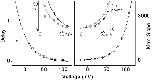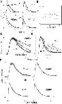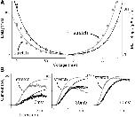 Figure 11. . Effect of back reactions with zβ < zα. α0= 1, β0= 1, zα = 0.85, zβ = 0.17 (arbitrary units). From Eqs. A3 and A4, ≈−40 mV and V1/2 ≈ 42 mV. (A) Symbols, simulated td(V) and SMax(V). Thick lines, predicted delay or maximum slope without deactivation. Deactivation shortens the delay and reduces the maximum slope for all but the highest voltages. Thin line (delay), fit of td(V) with the four-step model (Eq. 4), apparent α0= 1.7 and zα = 0.66. Thin line (slope), fit of Smax(V) with Eq. 3 and zα forced to the value from the delay fit. The resulting fit is not very good, Smax(V) is somewhat steeper. (Inset) Experimental example. td(V) and SMax(V) relations (delay fit, α0= 6.7 s−1, zα = 0.57; slope fit, zα forced to 0.57). (B) Fits of simulated PO(t) rise (thick lines) with Eq. 2 and the apparent parameters from the td(V) fit (thin lines). At 0 mV, the fit amplitude is larger, and at 30 mV it is smaller than the peak PO. At 90 mV, Eq. 2 needs to be strongly upscaled to fit the early rising phase of PO. (Inset) Experimental example, as in A. When fitting the recorded current rise with Eq. 2 and the parameters from the delay fit, the fit amplitudes at 0 and 30 mV are smaller, and at 90 mV larger than the peak current. |