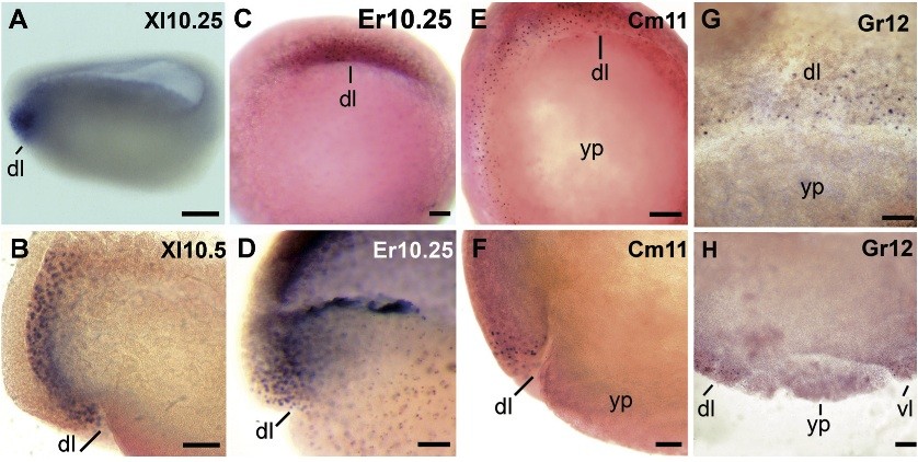 Fig. 2. Lim1 in the dorsal blas- topore lip. In situ hybridization against Xlim1 mRNA is shown in (A); the remaining embryos were immunostained against Lim1 protein. (A,B) Early gastrulae of X. laevis. (A) Xlim1 mRNA expres- sion. (B) The dorsal blastopore lip in sagittal view reveals the internal Lim1 protein signal. (C,D) Gastrulae of E. randi. (C) Surface Lim1 protein signal in the dorsal blastopore lip. (D) The dorsal blas- topore lip in sagittal view. The dark line in the middle of the image is due to unspecific stain- ing of the blastocoel floor. (E,F) Early gastrulae of C. machalilla. (E) The surface Lim1-signal is visible in the dorsal blastopore lip, and in a belt around the blastopore. (F) The dorsal blastopore lip in sagittal view reveals the internal signal. (G,H) Mid gastrulae of G. riobambae. (G) Lim1 signal at st 12 occurs in a belt around the blastopore with a strong dorsal expression. (H) The blastopore of a st 12 embryo in sagittal view. A higher density of Lim1-positive nuclei were detected in the dorsal blastopore lip in comparison with the ventral lip. Abbreviations: dl, dorsal lip; vl, ventral lip; yp, yolk plug. Scale bars: 200 μm (A,E,G,H); 100 μm (B,C,D,F). |