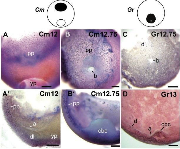 Fig. 4 (Above). The prechordal plate in slow developing embryos. (A,B Gastrulae of C. machalilla. (A) Mid-gastrula in whole mount. (A Sagittal section of a mid-gastrula. (B) Late-gastrula in whole mount. (B Sagittal section of a late- gastrula. The prechordal plate is Lim1 positive in A-B (C,D) Late gastrulae of G. riobambae. (C) Late-gastrula in whole mount. An image of this embryo at higher magnification was published (del Pino et al., 2007). (D) Sagittal section of a late- gastrula. The dorsal Lim1-positive region may represent the prechordal plate. The drawings outline in black the Lim1 signal; Abbreviations: a, archenteron; b, blasto- pore; cbc, circumblastoporal collar; d, dorsal; dl, dorsal lip; pp, prechordal plate; yp, yolk plug. Scale bars: 500 μm (C); 300 μm in (A); 200 μm in (AB, BD). |