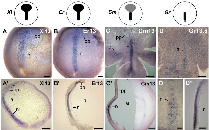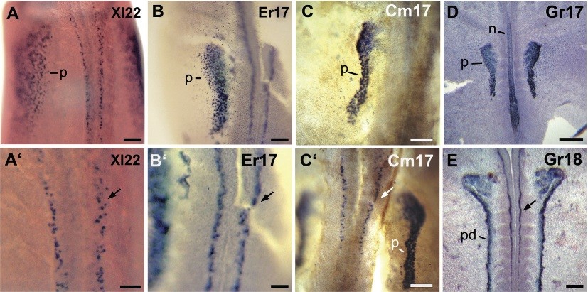 Fig. 6. Lim1 in the pronephros and cns. (A,A X. laevis neurula. (A) The image is focused in the pronephros. (A Lim1-positive cells of the cns from the embryo in (A). (B,B E. randi neurula. (B) Image focused in the pronephros. (B Lim1-positive cells of the cns from the embryo in (B). (C,C C. machalilla neurula. (C) Image fo- cused in the pronephros. (C Lim1- positive cells of the cns from the embryo in (C). (D,E) G. riobambae neurulae. (D) Lim1 staining of the pronephros and notochord. Cells of the cns were not detected at this stage in G. riobambae em-