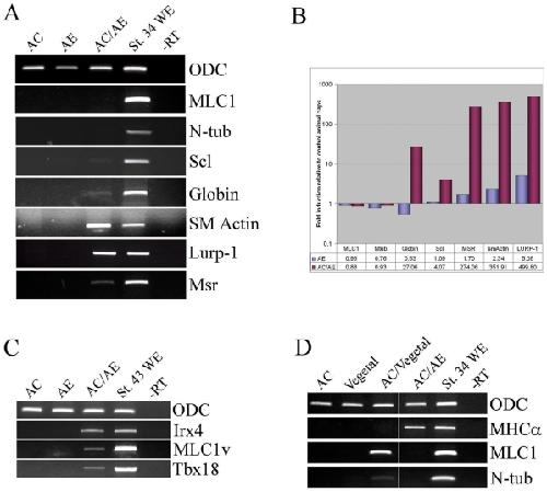 Figure 2. Specificity of anteriorendoderm as inducer of cardiac fate.(A) anteriorendoderm induces markers of cardiovascular cell types: blood (Scl, Globin), smooth muscle (SM actin), macrophages (Lurp-1) and endothelium (Msr), but not skeletal muscle (MLC1) or neural tissue (N-tubulin). (B) Quantification of RT-PCR shown in A. (C) Late tadpole-stage AC/AE explants express markers of ventricular myocardiumIrx4 and MLC1v and of the proepicardium, Tbx18. (D) animal cap/vegetal pole conjugates (Nieuwkoop sandwiches) express skeletal muscle and neural, but not cardiac markers, in contrast to AC/AE conjugates.