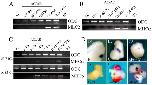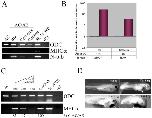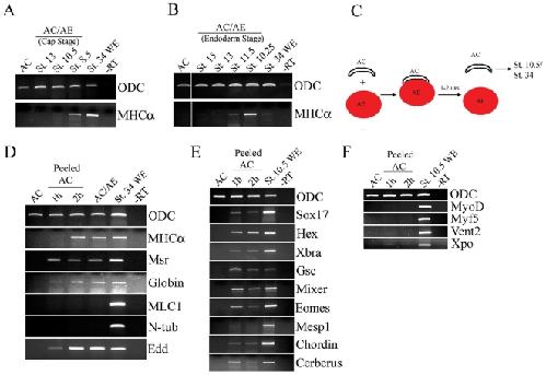 Figure 3. Two hours of contact between animal cap and anteriorendoderm is sufficient for cardiogenesis.(A) Conjugates were made between st. 10.25 anteriorendoderm explants and animal caps of aged animal caps isolated at st. 8.5, and MHCα expression was analyzed a day and a half later, at st. 34. (B) Conjugates were made between st. 8.5 animal caps and aged anteriorendoderm explants isolated at st. 10, as indicated. MHCα expression was analyzed at st. 34. (C) Strategy for a peeled animal cap assay. Rhodamine-dextran injected anteriorendoderm is conjugated with animal caps, and the caps are removed after 1 or 2 hours. Anteriorendoderm-free (rhodamine-negative) animal caps are cultured until st. 34 or for a total of 2.5 hours after the initial contact, corresponding to st. 10.5 (D) Only animal caps that were in contact with anteriorendoderm for 2 hours express MHCα, but other markers tested â Msr, Globin, Edd â are also induced after 1 hour of contact. (E) Early markers of endoderm (Sox17, Hex, Cerberus, Mixer), Organizer (Goosecoid (Gsc), Chordin) and mesoderm (Xbra, Eomesodermin) are expressed after 1 hour contact with anteriorendoderm. However Mesp1, a marker of migrating cardiac precursors [62], was not induced. (F) Myogenic regulatory factors MyoD and Myf5 as well as posterior markers Xpo and Vent2 are not induced by AE.