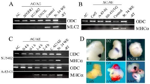 Figure 4. FGF and Nodal signaling are required during the first hour of cardiac induction.(A) AC/AE conjugates were made with animal cap expressing δFGFR1 or with uninjected animal cap that were continuously incubated with SU5402 (50 µM) or U0126 (35 µM) from the time of conjugation, or were treated with DMSO (Control). MLC2 expression was analyzed at st. 34. (B) CerS (injected in animal cap) or continuous incubation with SB-431542 (75 µM) or A-83-01 (75 µM) block induction of MHCα. (C) FGF and Nodal signaling are only required the first hour of contact between AC and AE. (D) In situ hybridisation analysis of cardiac TnI expression in AC/AE conjugates. D1,2- control embryo and AC/AE explant. 83% (nâ=â23) explants are cTnI+. D3- expression of δFGFR1 in animal caps leads to a greatly reduced expression of cTnI in 89% (nâ=â19) explants. D4- 0/15 of CerS explants express cTnI. D5- mosaic expression of δActRI (red) in animal caps prevents expression of cardiac TnI (0/11 cTnI+ explants in δActRI-injected cells), but not in neighboring tissue with intact Nodal signaling (5/11 cTnI+ explants; arrow in D5). D6- constitutively active Alk4* receptor induces cardiac expression cell-autonomously in animal caps (4/4 cTnI+, nâ=â12).