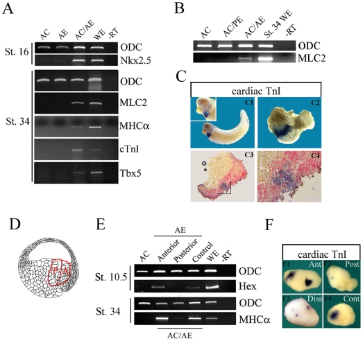 Figure 1. Anteriorendoderm is sufficient to induce cardiogenesis in animal cap cells.Gene expression in explants were analyzed either by RT-PCR (A,B,E) or by in situ hybridization (C). (A) AC/AE conjugates express Nkx2.5 at st. 16, but animal caps and anteriorendoderm alone do not. Cardiomyocyte-specific markers MLC2, MHCα and cardiac TnI, as well as cardiogenic transcription factor Tbx5 are all expressed in AC/AE conjugates at st. 34. (B) PosteriorEndoderm (PE) is incapable of inducing cardiogenesis in animal caps. (C) Cardiac tissue (MLC2 expression; C1) is induced by anteriorendoderm in animal cap·. Animal caps injected with biotinylated dextran were used to make conjugates with anteriorendoderm, and after in situ hybridization for cardiac TnI (C2), lineage tracer was revealed by Fast Red staining on sections (C3,4). (D) A drawing of NF st. 10 embryo describing anteriorendoderm explants and their subdivision into anterior (A) and posterior (P) parts. Source of drawing: www.xenbase.org. (E) Anterior half of anteriorendoderm explants is greatly enriched in Hex expression (St. 10.5) and is a more efficient inducer of cardiogenesis in animal caps at st. 34. (F) Cardiac-inducing activity resides in the anterior (Ant) part of anteriorendoderm explants. Double anteriorendoderm/animal cap conjugates show two foci of cardiac TnI expression (F1), whereas double posteriorendoderm/animal cap conjugates contain only few positive cells (F2). Dissociated and reaggregated anteriorendoderm (Diss; F3) induces multiple smaller foci of cardiac gene expression in animal cap (in all 5 positive conjugates; nâ=â12). F4: control conjugates most frequently have a single cluster of cardiomyocytes (8/8 in this experiment, and 88% of all expressing explants overall, nâ=â74).