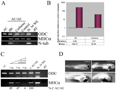 Figure 6. BMP signaling is not required for cardiogenesis in AC/AE model.(A) Animal caps expressing truncated type I BMP receptor (tBR) or Cerberus (1 ng of mRNA each), were conjugated with anteriorendoderm and conjugates were analyzed for expression of MHCα and N-tubulin at st. 34 by RT-PCR. (B) Quantification of RT-PCR in A. Both anti-BMP reagents used were active, as shown by induction of N-tubulin expression, but had no effect on cardiogenesis. (C) Dose-dependent inhibition of cardiogenesis in AC/AE explants by Cerberus. Animal caps from embryos injected with 1, 2 or 4 ng of Cerberus mRNA were conjugated with anteriorendoderm and conjugates were analyzed for MHCα expression when sibling control embryos reached st. 34. The effect of Cerberus was quantified and normalized to control conjugates (% C AC/AE). (D) Phenotypic controls for Cerberus mRNA, showing dose-dependent increase in cement gland tissue.