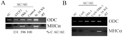 Figure 7. Dkk-1 enhances cardiogenesis.(A) animal cap injected with 0.5 ng of δTcf3 or 1 ng of Dkk-1, or uninjected control animal cap, were conjugated with anteriorendoderm and analyzed for MHCα expression. The effect of Dkk-1 was quantified and shown below the image. In two additional experiments, Dkk-1 stimulated cardiogenesis 5- and 9-fold. (B) Dkk-1 cannot act in Nodal-independent manner, as it is blocked by CerS. The effectiveness of δTcf3 was shown by posteriorization of embryos (data not shown).
