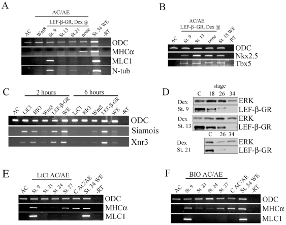 Figure 8. Elevated Wnt/β-catenin signaling opposes cardiogenesis after specification.(A) Animal cap expressing either CSKA-Wnt8 or LEF-β-catenin-GR were conjugated and dexamethasone was added as indicated. All treatments block cardiogenesis. (B) LEF-β-GR activated at st. 9 and st. 13 has no effect on Nkx2.5 and Tbx5 expression at st. 18. (C) The effect of various agonists on the Wnt/β-catenin pathway: LiCl and BIO cause strong transient activation, Wnt8 causes weak and sustained activation, and LEF-β-catenin-GR causes strong and prolonged effect. Siamois and Xnr3 expression was analysed 2 and 6 hours after excision of animal caps/Treatment with LiCl, BIO and Dex was immediately after the excision. (D) The expression of the LEF-β-catenin-GR fusion protein was analyzed by Western blotting for HA tag. The protein was expressed efficiently at all stages at which dexamethasone was added and it persists for many hours. (E, F) LiCl or BIO treatment at st. 9 has no effect on cardiac differentiation but induces skeletal muscle. Later treatment at st. 21 or 24 blocks cardiac differentiation, and treatment at st. 27 has no effect.