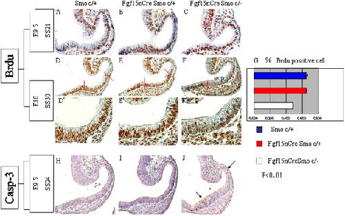 Fig. 3. Cell proliferation and cell death defected in Smo-CKOs. BrdU incorporation analysis was performed (see Section 4). (AâC) At the 21-somite stage (E9.75), Controls and the mutants showed similar incorporation rates at the 21-somite stage (AâC). (DâF) At the 30-somite stage (E10.5), in Control 1 (D, n = 3, 64.66 ± 0.98%) the ventral optic cup showed a comparable rate with Control 2 (E, n = 3, 66.97 ± 0.34%) while Smo-CKOs (F, n = 3, 47.27 ± 0.48%) showed significantly decreased rates of BrdU incorporation (G). (Dâ²âFâ²) Higher power-views of the ventral optic cups in DâF. (HâJ) Caspase-3 was immunostained. In the optic vesicle of Control 1 (H) and Control 2 (I), there were few Caspase-3-positive cells at the 21-somite stage while Smo-CKOs exhibited increased Caspase-3-positive cells in the optic vesicle (J, black arrows). vop: ventral optic cup. P < 0.01.