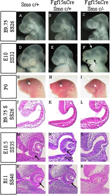 Fig. 2. Craniofacial morphology and eye histology. Craniofacial morphology: AâI. (AâC) The optic vesicle was not obviously different at the 26-somite stage (E9.75). (DâF) At the 32-somite stage (E10), Smo-CKOs showed the ventral defect of the optic cup (F, black arrow: vop) and the diencephalon was hypotrophic (F, white arrow). (GâI) P0: No eyes were observed in Smo-CKOs (I, white arrowhead) and the forebrain part was small (I, white arrow), while Contol 1 (G) and Control 2 (H) did not show any abnormality. Eye histology: JâR. (JâL) At the 26-somite stage (E9.75), the optic cup of Smo-CKOs was not obviously different from that of Controls. (MâO) At the 35-somite stage (E10.5), Smo-CKOs displayed the ventral half defect of the optic cup and the hypotrophic lens was detected (O, green arrow). (PâR) At the 40-somite stage (E11), the ventral half of the optic cup and the lens were missing in Smo-CKOs (R). Control 1 (P) and Control 2 (Q) did not show any abnormality. vop: ventral optic cup.