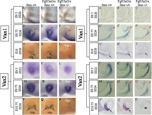Fig. 5. Vax1 and Vax2 expression patterns in the optic vesicle and cup. (AâR) Side views of whole mount in situ hybridization. (Aâ²âRâ²) In situ hybridization on coronal sections. (AâC, Aâ²âCâ²) At the 20-somite stage (E9.5), the Vax1 mRNA expression pattern in Smo-CKOs was not obviously different from that in Controls. (DâF, Dâ²âFâ²) At the 24-somite stage (E9.75), comparing with Control 1 (D and Dâ²) and Control 2 (E and Eâ²), Vax1 mRNA was not expressed on the dorsal optic cup of Smo-CKOs (F, Fâ², red arrow). (GâI, Gâ²âIâ²) At the 30-somite stage (E10), in Smo-CKOs (I and Iâ²), Vax1 mRNA was downregulated in the ventral optic cup (black arrow) while Control 1 (G and Gâ²) and Control 2 (H and Hâ²) showed Vax1 expression in the ventral optic cup (black arrow). (JâR, Jâ²âRâ²) Vax2 expression patterns were examined. (JâL, Jâ²âLâ²). At the 22-sfomite stage (9.5), Vax2 expression patterns in the optic cup were not obviously different in all genotypes. (MâO, Mâ²âOâ²) At the 24-somite stage (E9.75), comparing with Control 1 (M and Mâ²) and Control 2 (N and Nâ²), Vax2 mRNA was not expressed in the dorsal optic cup of Smo-CKOs (O, Oâ², red arrow). (PâR, Pâ²âRâ²) At the 38-somite stage (E10), Vax2-positive ventral optic cup disappeared completely in Smo-CKOs (Râ², asterisk) while Control 1 (P and Pâ²) and Control 2 (Q and Qâ²) showed Vax2 expression in the ventral optic cup (black arrow). dop: dorsal optic vesicle/cup. vop: ventral optic vesicle/cup.