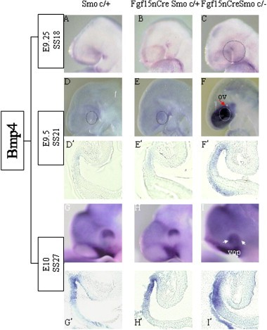 Fig. 6. Bmp4 expression is up-regulated in the Smo-CKO eye region. (AâC) At the 18-somite stage (E9.25), the mutant embryos exhibited slightly increased Bmp4 mRNA in the optic vesicle (C, dotted circle), compared to Controls (A and B). (DâF, Dâ²âFâ²)At the 21-somite stage (E9.5), the Bmp4 mRNA was greatly increased in the optic vesicle (ov) of the Smo-CKOs (F, Fâ², red arrow). (GâI, Gâ²âIâ²) At the 27-somite stage (E10), in Control 1(G and Gâ²) and Control 2 (H and Hâ²), Bmp4 mRNA was confined to the dorsal optic cup only, while in Smo-CKOs (I) Bmp4 mRNA was detected in both the ventral optic cup (vop) and the dorsal optic cup (dop).
