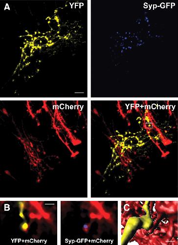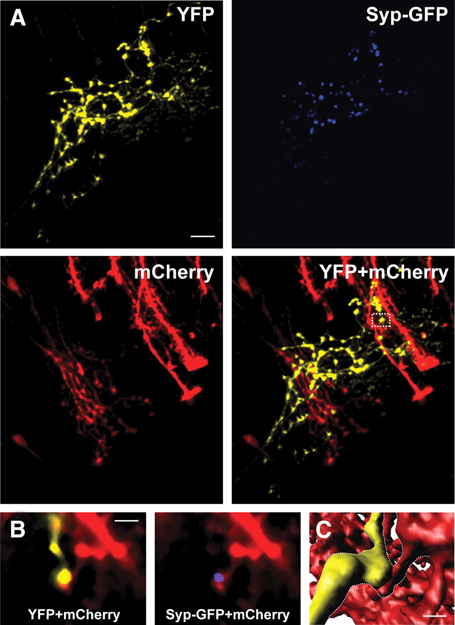 Radial glial processes contact retinotectal synaptic sites. A, z-Projections of RGC axon labeled with YFP (top left), coexpressing Syp-GFP to reveal presynaptic sites (top right), radial glia expressing mCherry in the same animal (bottom left), and YFP axon with radial glia expressing mCherry (bottom right). B, Higher-magnification single optical section from A (white square) to demonstrate contact between the RGC axon and glial process (left) at a Syp-GFP punctum (right). C, Three-dimensional reconstruction of the YFP+mCherry image in B. Scale bars: A, 10 μm; B, 5 μm; C, 3 μm. |