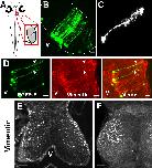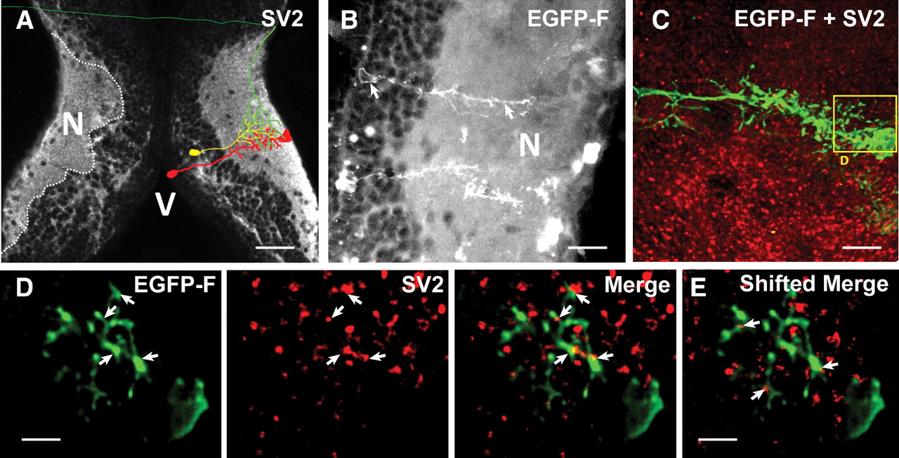 Radial glial processes contact synapses in the optic tectum. A, Schematic of the main tectal cell types overlaid on an horizontal section through the optic tectum: glial cell (red), tectal neuron (yellow) and RGC axon (green). The neuropil (N) area is revealed by immunostaining for the synaptic vesicle marker SV2. B, Tectal section shows bushy EGFP-F-labeled glial processes in the neuropil. C, z-Projection of SV2 immunostained Xenopus brain whole mount in which there is a glial cell expressing EGFP-F (box indicates the high-magnification sections in D). D, Single optical section shows that EGFP-F-labeled processes are apposed to SV2-positive synaptic puncta (arrowheads). E, Example of reduced colocalization observed when the red and green images are offset by 5 μm in the z-axis (N = 4 whole mounts). Scale bars: A, 40 μm; B, C, 15 μm; D, 10 μm. V, Ventricle; N, neuropil. |