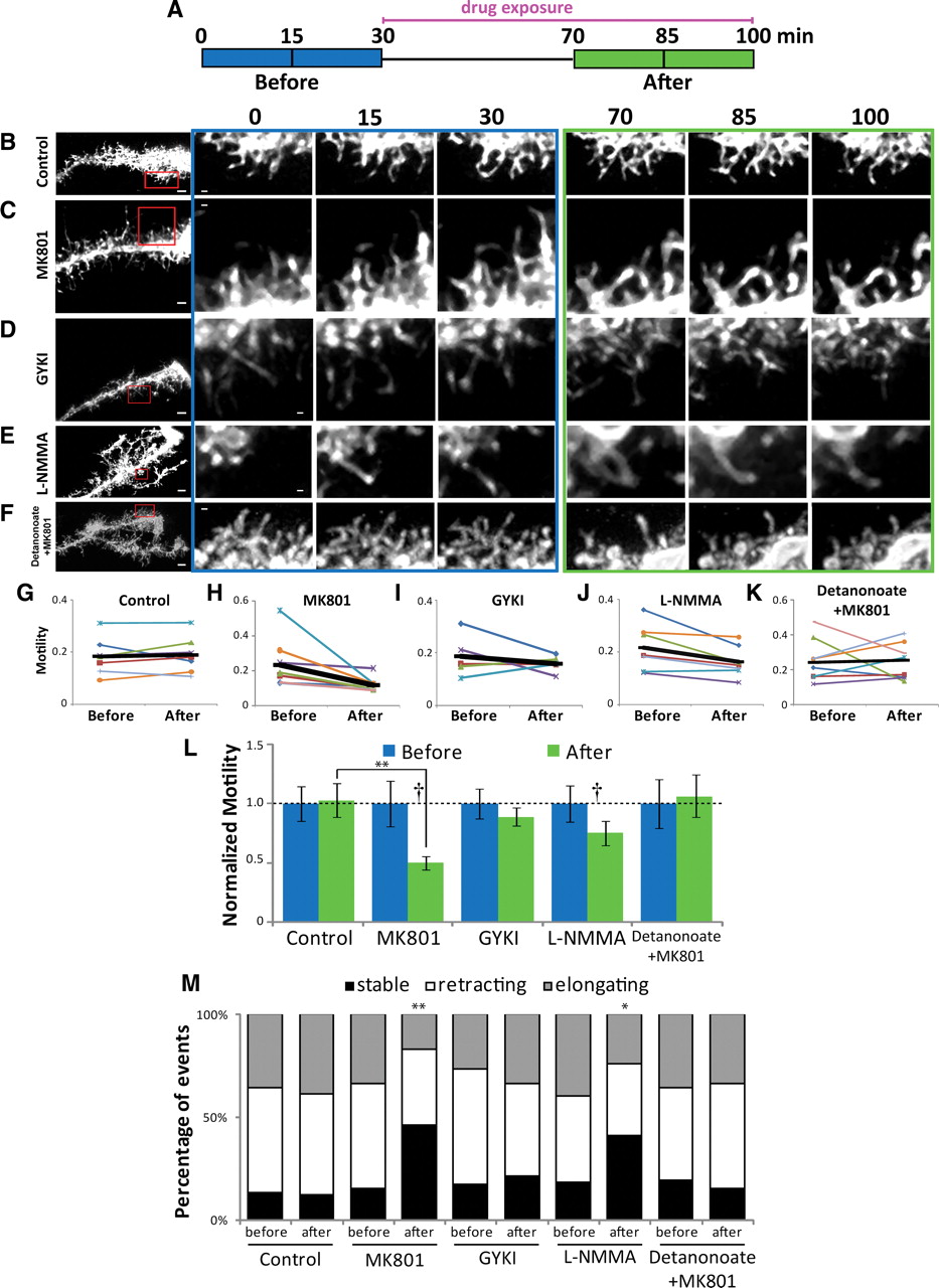 Rapid structural remodeling is regulated by neuronal NMDAR activation and NO signaling. A, Schematic of the imaging protocol. B–F, Examples of 15 min interval time series z-projections of glia treated with control medium (B), MK801 (C), GYKI-54266 (D), L-NMMA (E), and DetaNONOate + MK801 (F). Cells were all expressing EGFP-F and imaged in vivo. G–K, Motility analysis of all control (N = 7) (G), MK801 (N = 9) (H), GYKI-54266 (N = 7) (I), L-NMMA (N = 7) (J), and DetaNONOate + MK801 (N = 9) (K) cells before and after treatment. Thick black lines represent group means. L, Relative motility for the different groups before and after treatment. M, Distributions of elongating, retracting and stable filopodial behaviors for the different groups before and after treatment. Scale bars: A–F, left panel, 5 μm; A–F, right panel, 0.5 μm. †p < 0.05, two-tailed paired t test; *p < 0.05; **p < 0.01, ANOVA with Bonferroni post hoc test. Error bars are SEM. |